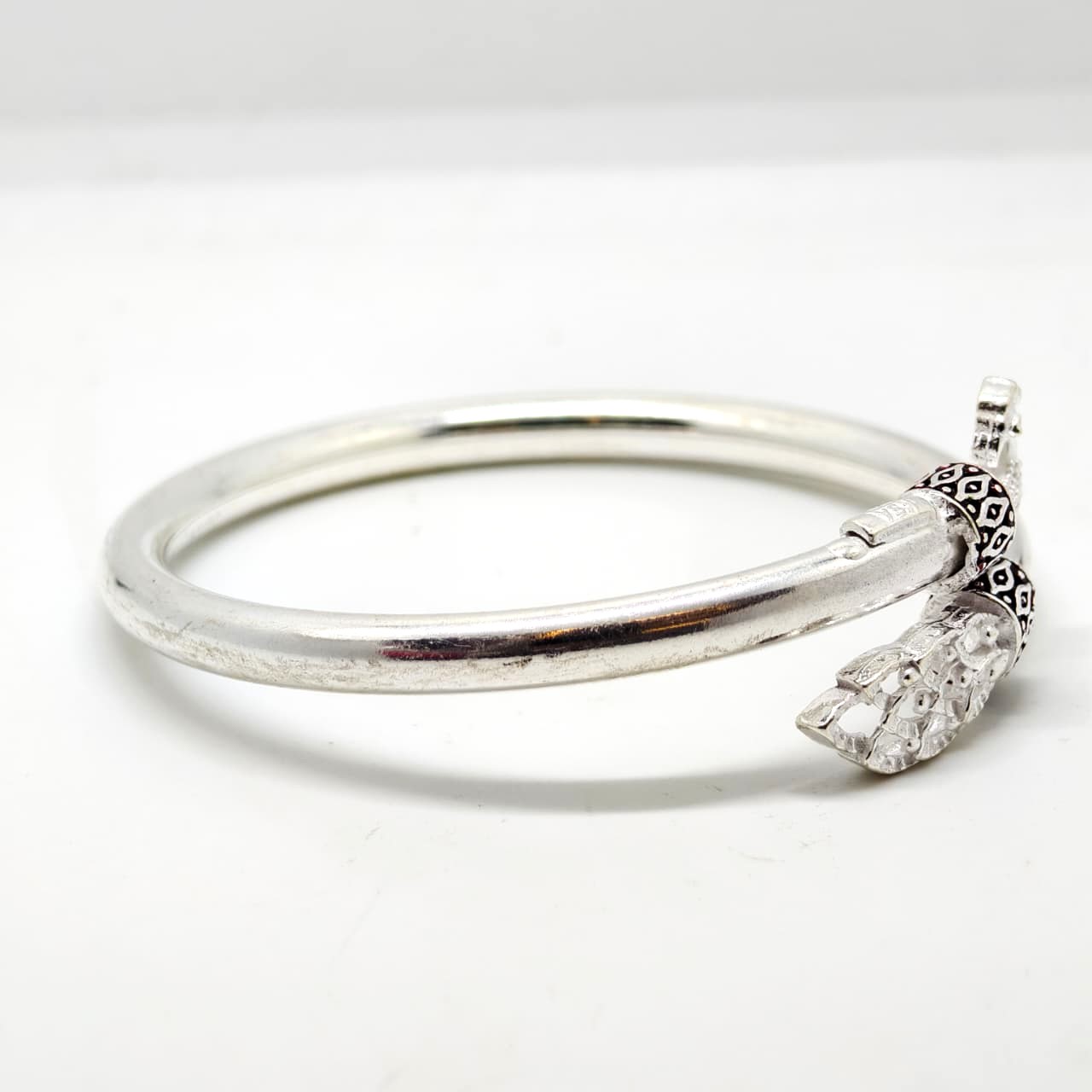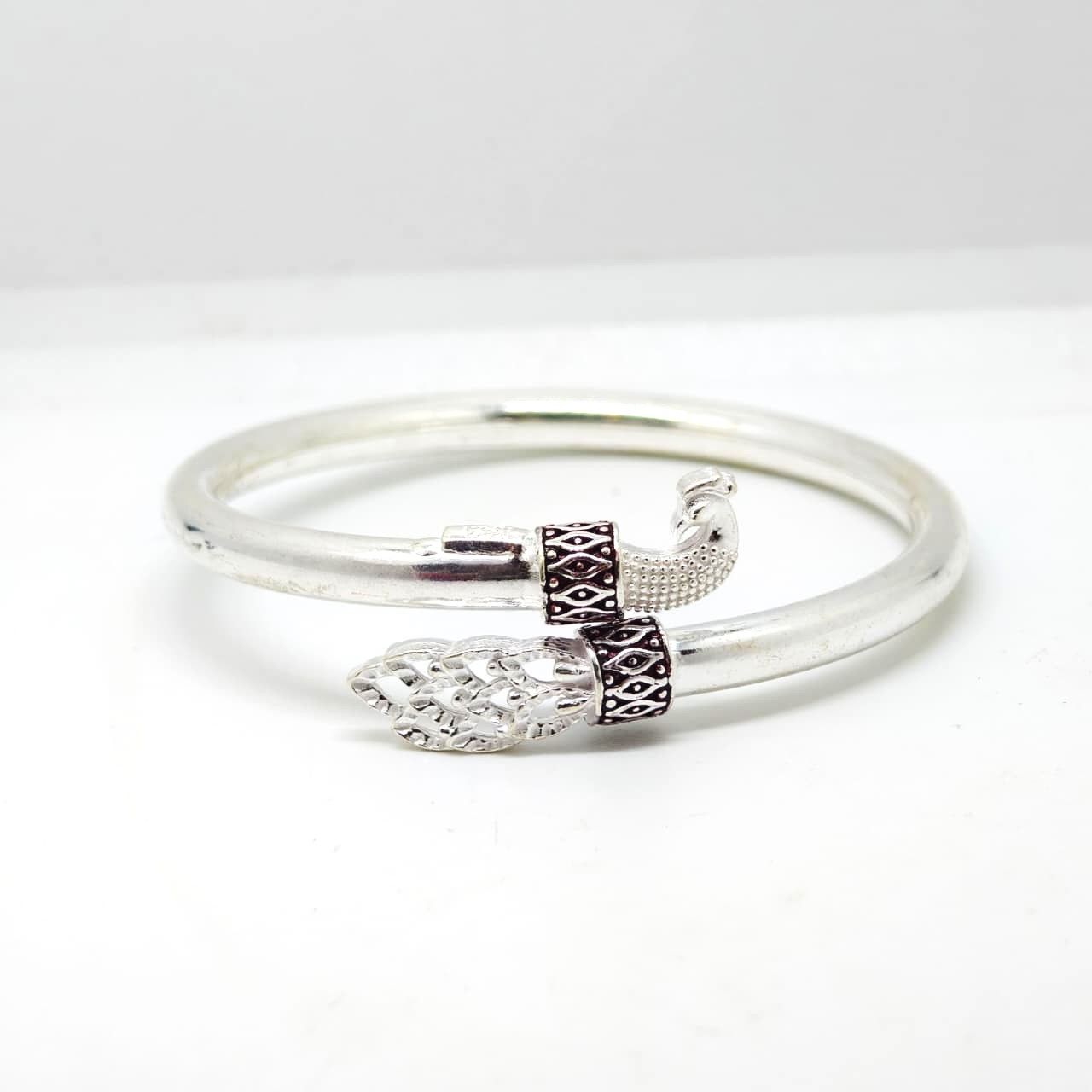 The Classic Peacock Feather Silver Kada showcases a simple yet artistic peacock feather pattern engraved along its surface. Crafted in high-quality 92.5 sterling silver, it reflects traditional Indian craftsmanship with a modern touch. This plain yet elegant kada is perfect for women who love minimalist jewelry with cultural significance. Its versatility makes it suitable for casual wear or special occasions.