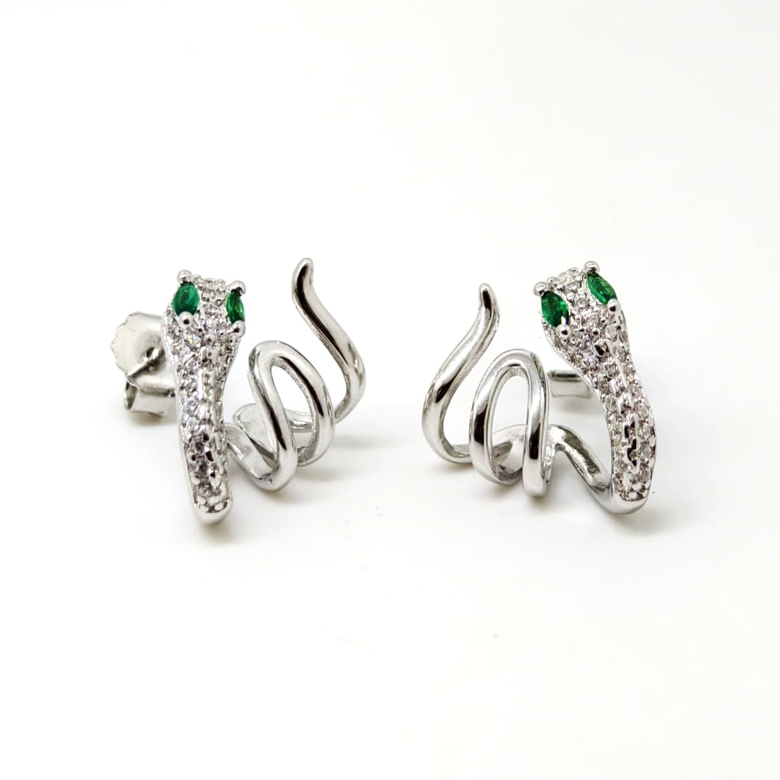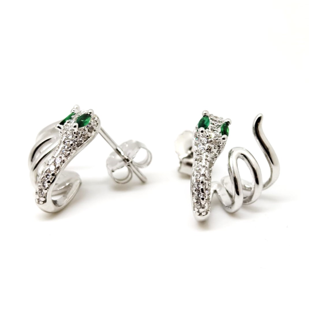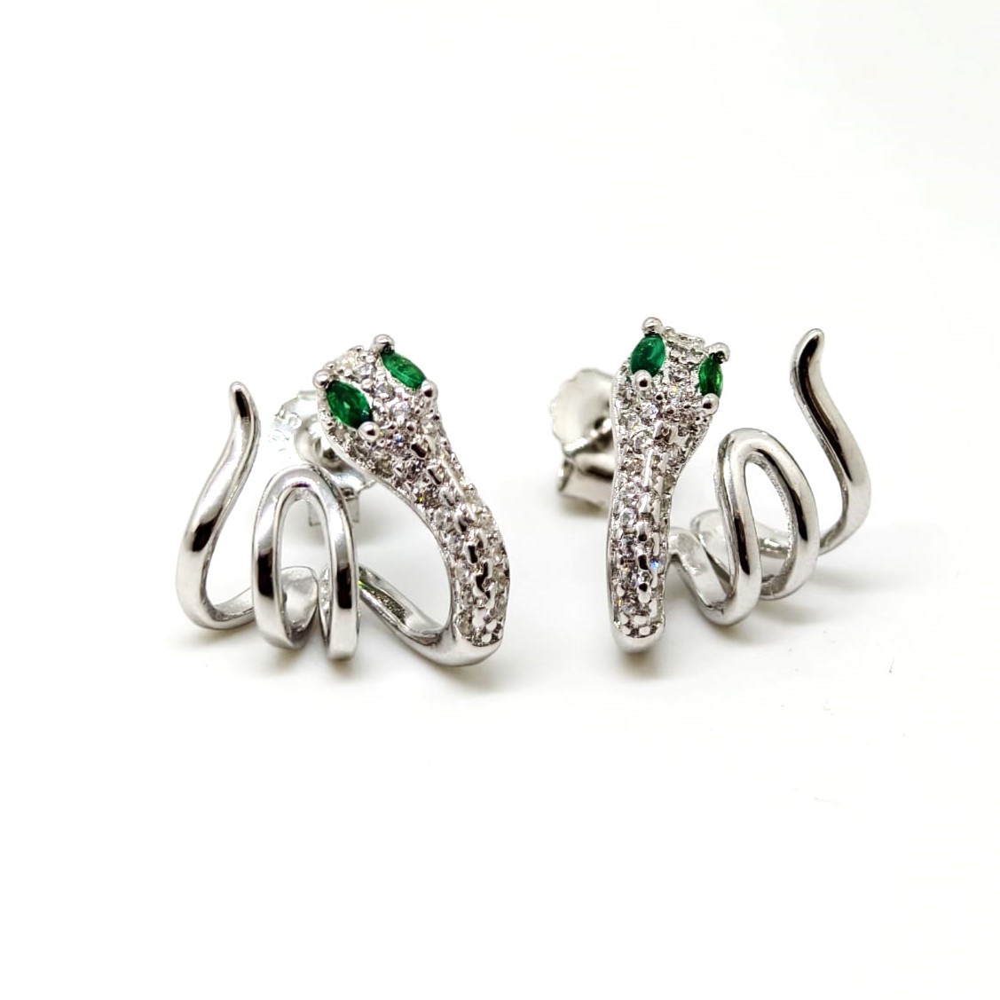 Verdant Coil Snake Drops feature an intricately sculpted snake form in polished sterling silver, accented with mesmerizing green eyes. Designed with subtle movement and dramatic detail, these earrings embody mystery and strength, making them a unique accessory for evening wear or bold fashion statements.